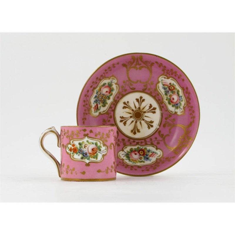 A 19th century coffee cup and saucer, decorated with floral sprays on a pink and gilt ground.