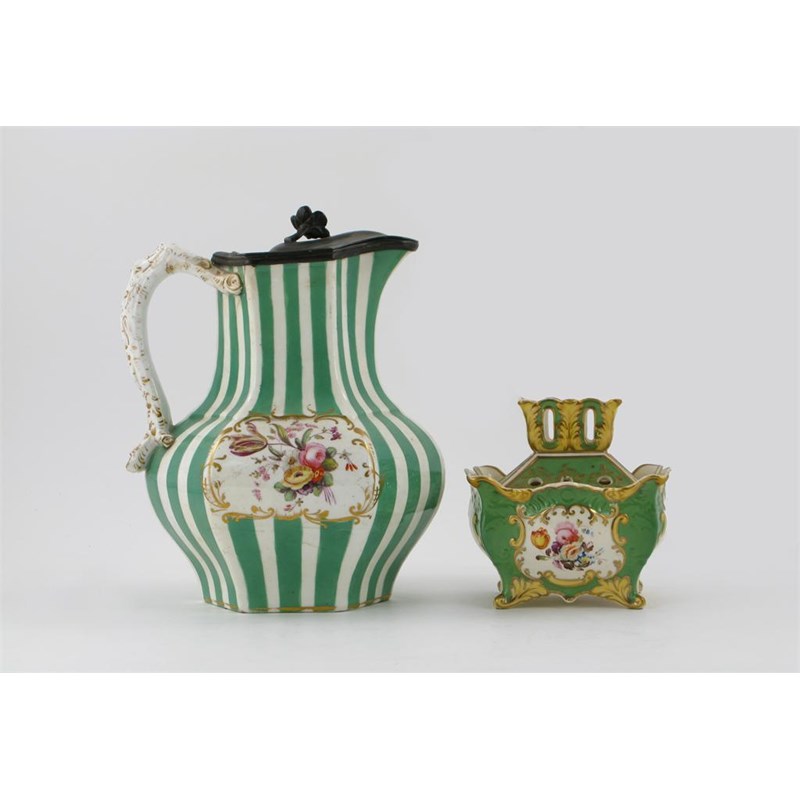 A 19th century Staffordshire ewer decorated with floral sprays on a green and white striped ground and a 19th century pot-pourri vase decorated with floral sprays on a leaf moulded green ground. (2)