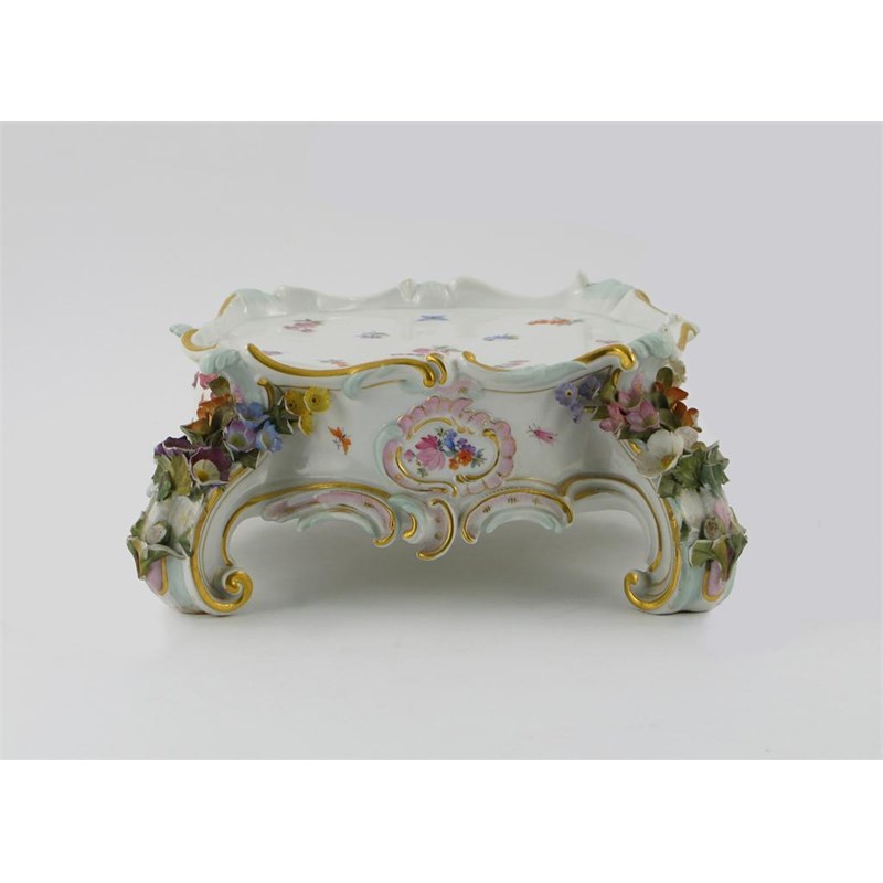 A late 19th century Meissen shaped rectangular stand decorated with floral sprays and applied flowers on a white and gilt ground, blue crossed sword mark, incised 605, 26.5 x 24 cm (10.5 x 9.5in).
