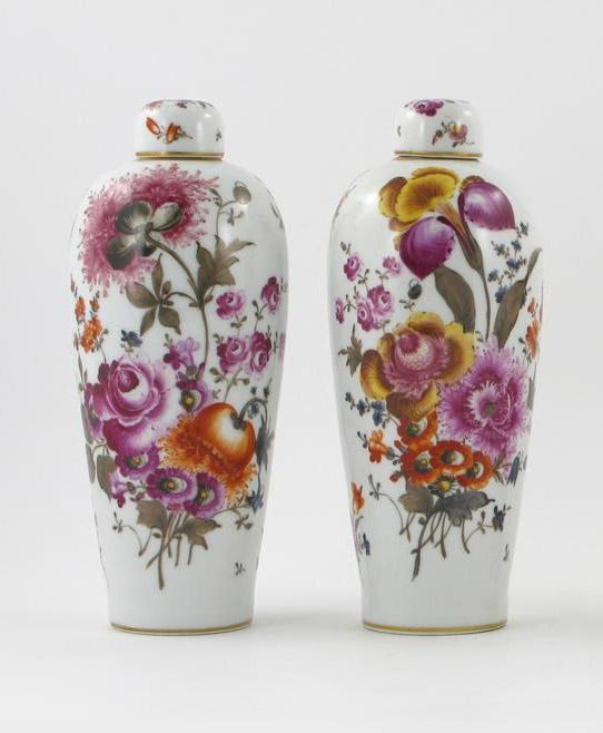 A pair of Dresden vases and lids