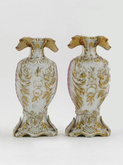 A pair of continental baluster vases with pink and gilt decoration on a white ground, the neck modelled with dog heads, 20cm (8in) high. (2)