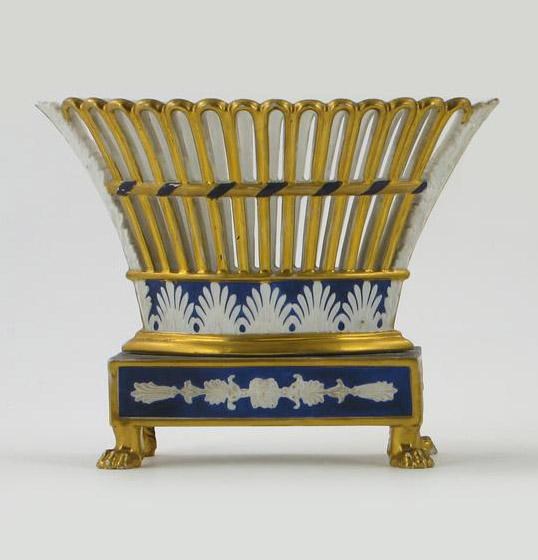 A continental oval pierced basket with gilt and blue leaf decoration on gilt claw feet, 18.5cm (7.25in) high.