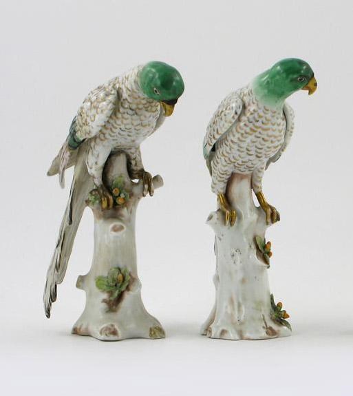A pair of continental figures of a parrot seated on a branch, 20.5cm (8in) high.
