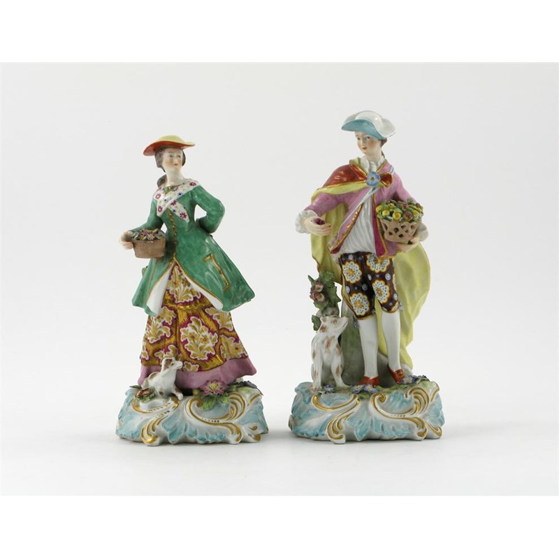 A pair of 19th century continental figures of a gallant holding a basket of fruit, his dog at his side, 22.5cm (8.75in) high and a lady holding a basket of fruit, a dog at her feet, 21cm (8.25in) high. (2)