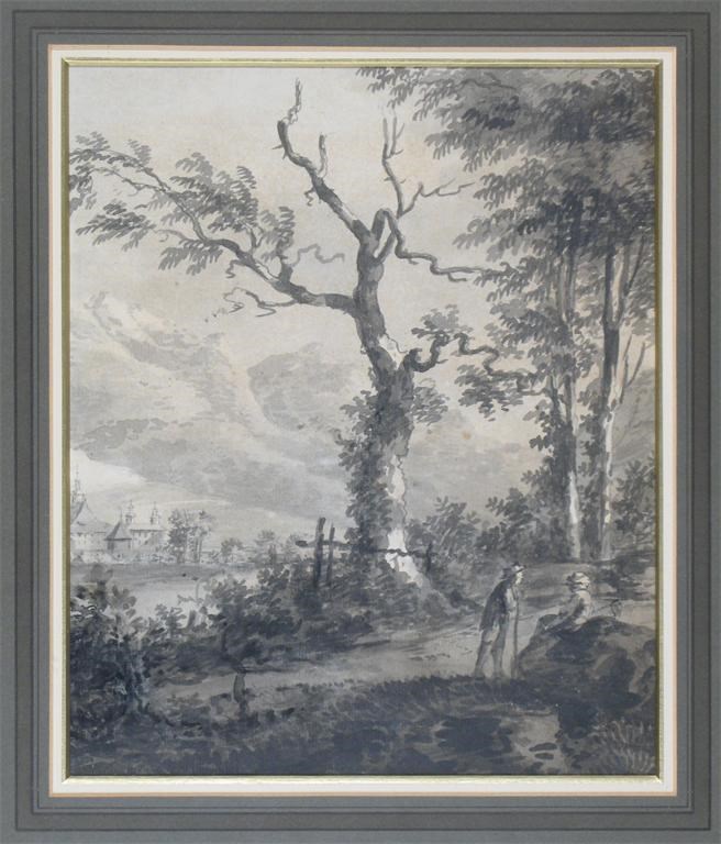 Continental School 19th century: Two landscapes with rustics, grisaille washes, 27 x 23cm and smaller, with a watercolour of a soldier in a landscape, 23 x 14.5cm (9 x 5.75in). (3)