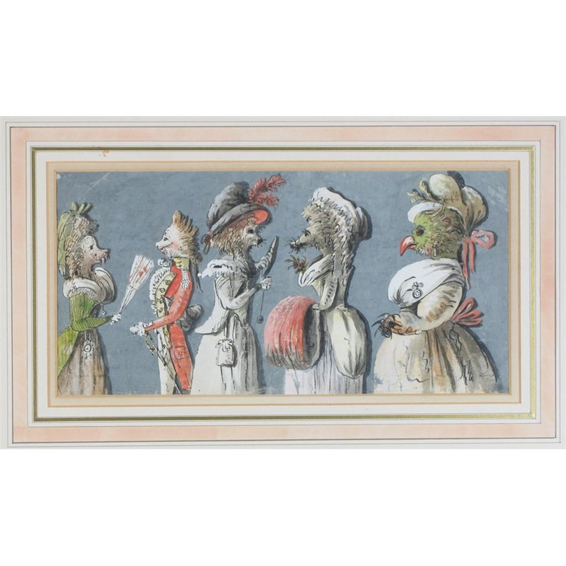 Isaac Cruikshank (c.1756-1811/16): Caricatures of Birds and Animals, pen, ink and watercolour, 14.5 x 29.5cm (5.75 x 11.5in).