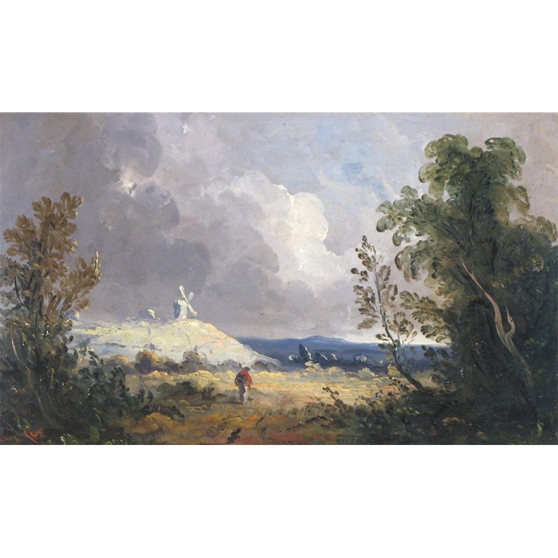 David Cox Sen. (1783-1859): A figure on a windy moor, a windmill beyond, oil on canvas, 21 x 37cm (8.25 x 14.5in).