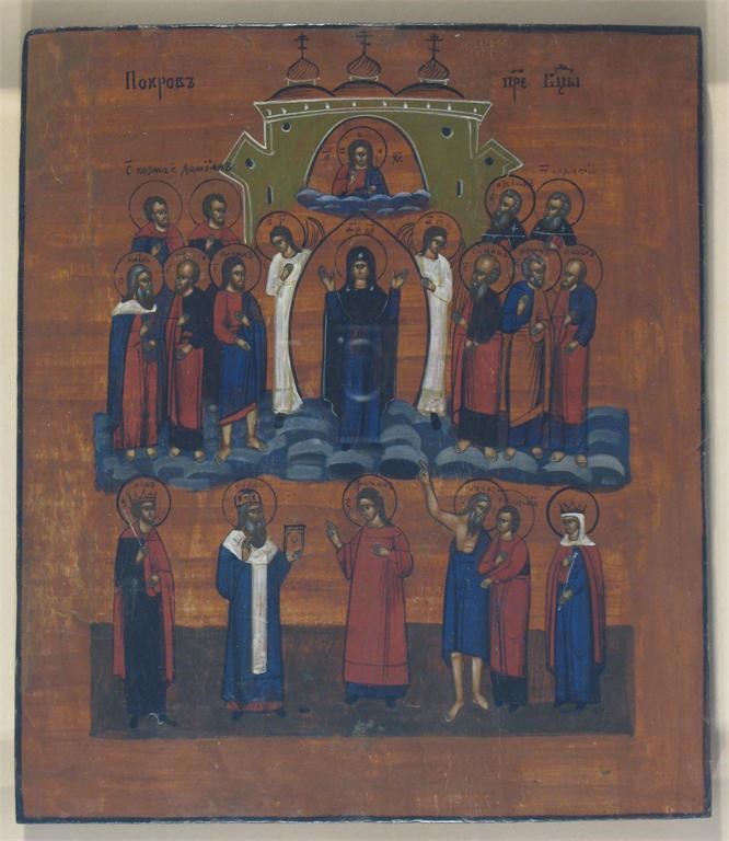 A Russian icon depicting Mary Magdalene, Jesus and various apostles and angels, 34 x 31cm (13.5 x 12in) and another depicting Mary Magdalene lying surrounded by figures, 33 x 25.5cm (13 x 10in). (2)