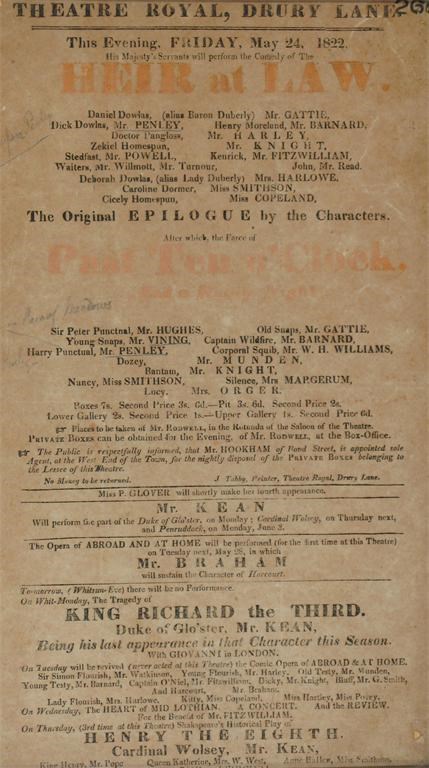 A programme for the Theatre Royal, Drury Lane, dated May 22nd 1822, with pencil annotations, framed, 33 x 19cm (13 x 7.5in).