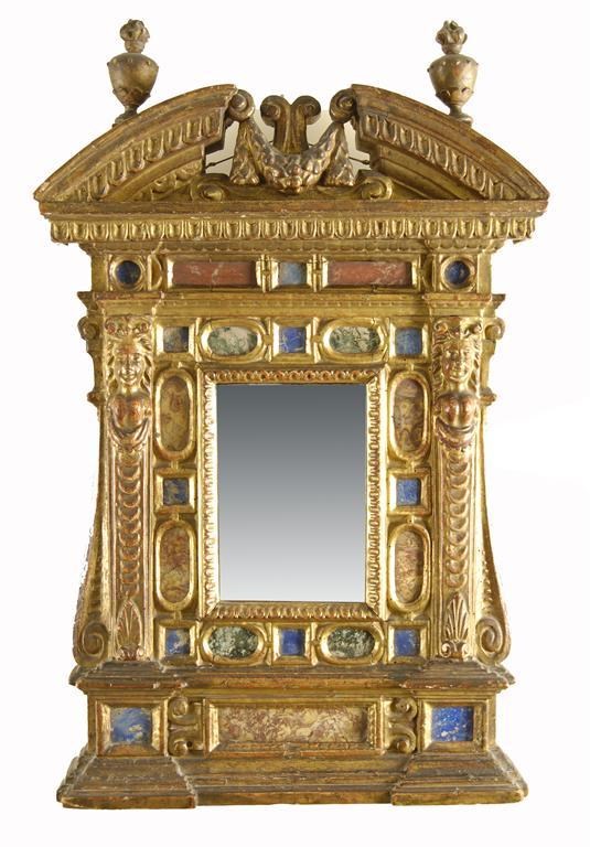 An Italian giltwood and gesso tabernacle frame, of architectural form, the broken pediment with flaming urn finials, 68.5cm (27in) x 43cm (17in).