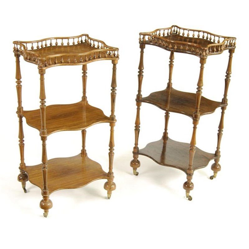 A 19th century Irish rosewood three tier étagère, with double serpentine baluster gallery, on turned baluster columns, the brass castors stamped 'J.W. Lewty's patent' bearing a trade label for 'Robert Strahan Cabinetmaker Upholsterer, Auctioneer and Undertaker', 24 Henry Street Dublin, 79cm (31in) high, 38cm (15in) wide, and a similar matched étagère, 77cm (30.25in) high, 38cm (15in) wide. (2)