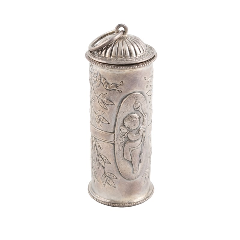 cylindrical form with embossed cherub and ribboned foliate decoration, the pull-out grater cover with a ring attachment, height 8.3cm, approx. weight 1.9oz.
