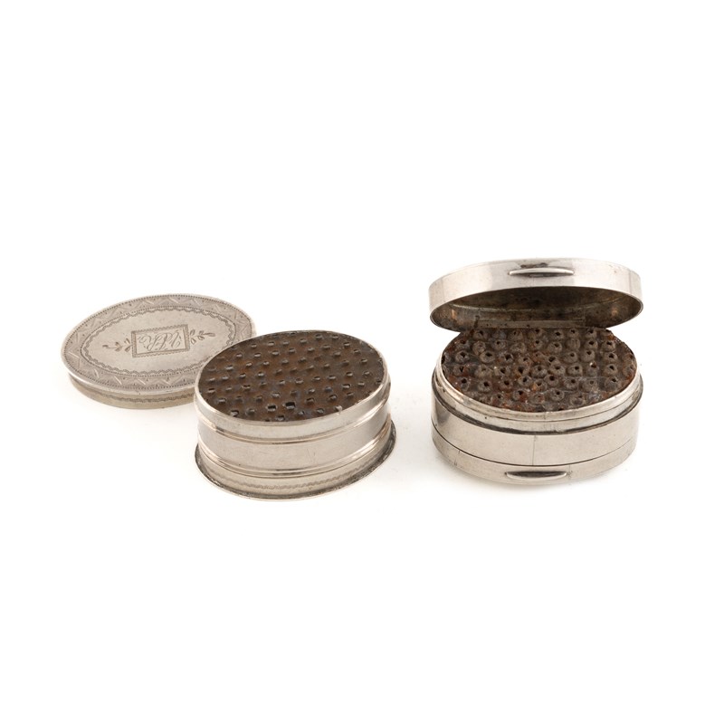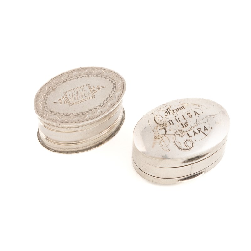 oval form, engraved borders, pull-off cover and base, the interior with a steel grater, plus an unmarked oval nutmeg grater, the hinged cover inscribed 'From Louisa to Clara', hinged base, the interior with a steel grater, approx. total weight 1.2oz. (2)