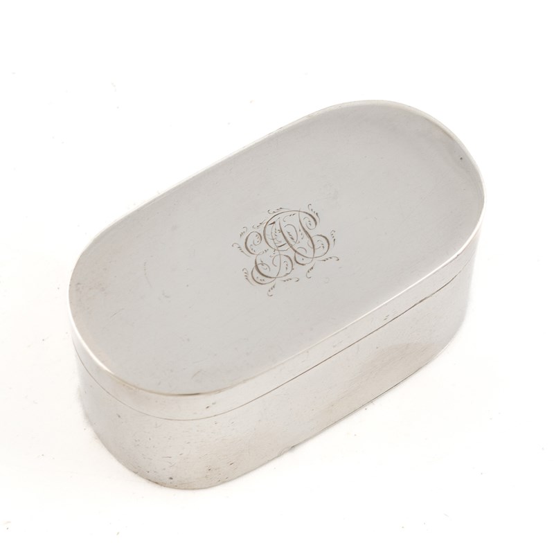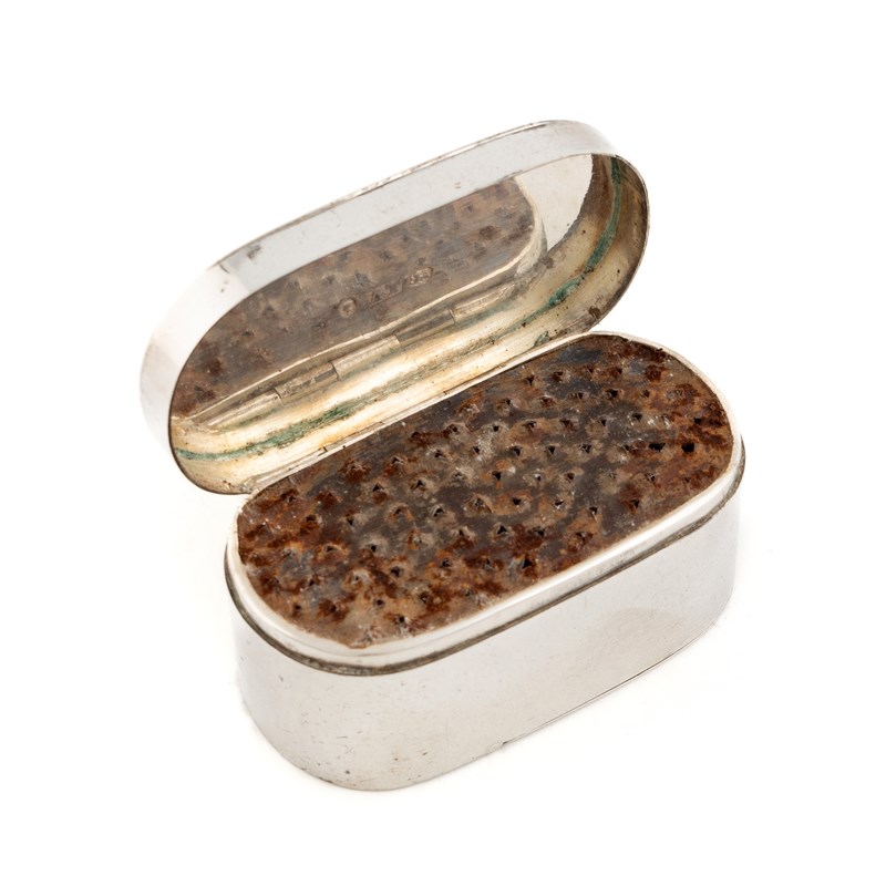 rounded rectangular form, the hinged cover initialled, hinged base, the interior with a steel grater, length 5.8cm, approx. weight 1.2oz.