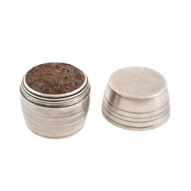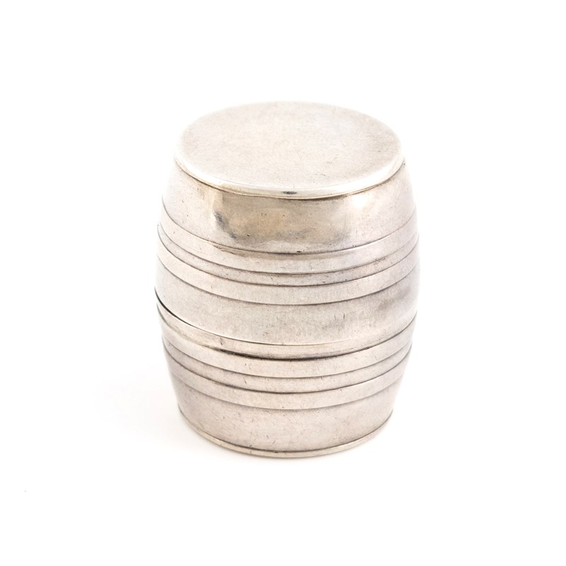 barrel form with band decoration, screw-off cover and to the interior a pull-off steel grater, height 2.8cm, approx. weight 0.5oz.