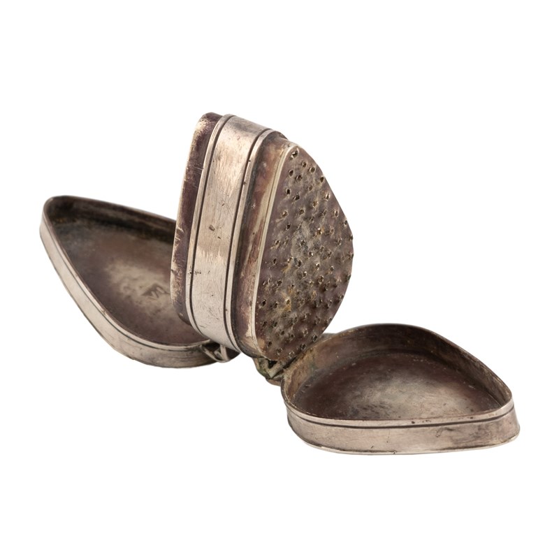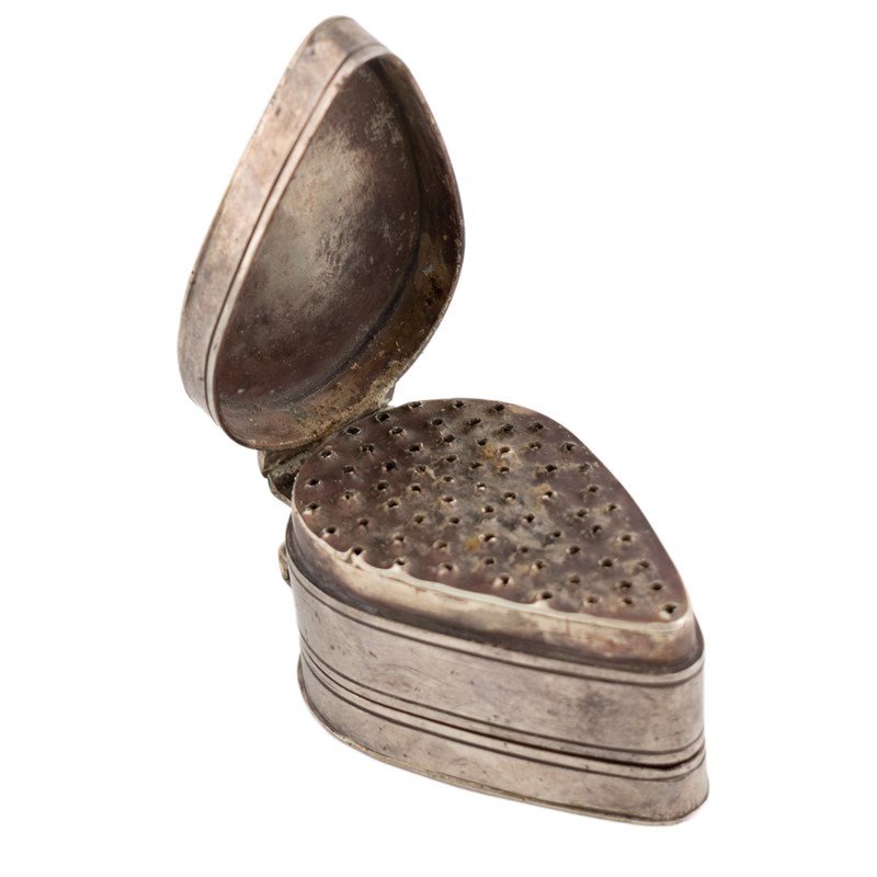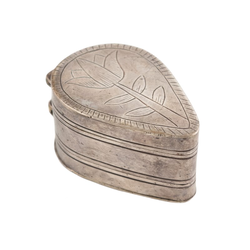 tear-drop form, the cover engraved with a simple tulip, engraved border, hinged cover and base with a grater to the interior, length 4.4cm, approx. weight 1oz.