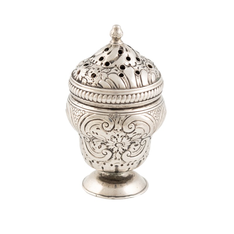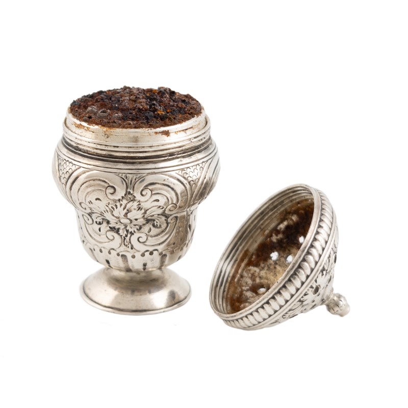 urn form with embossed scroll foliate decoration, screw-off pierced cover with a pull-out grater to the interior, height 4.6cm, approx. weight 0.5oz.