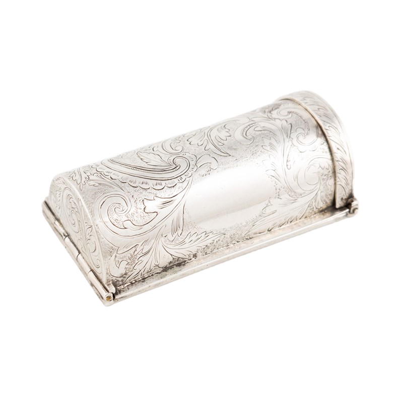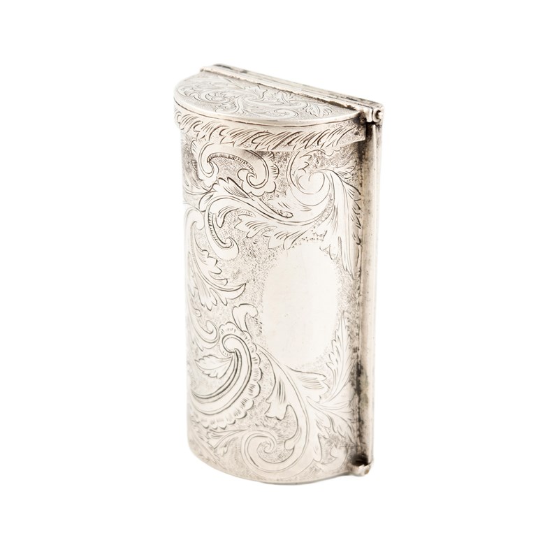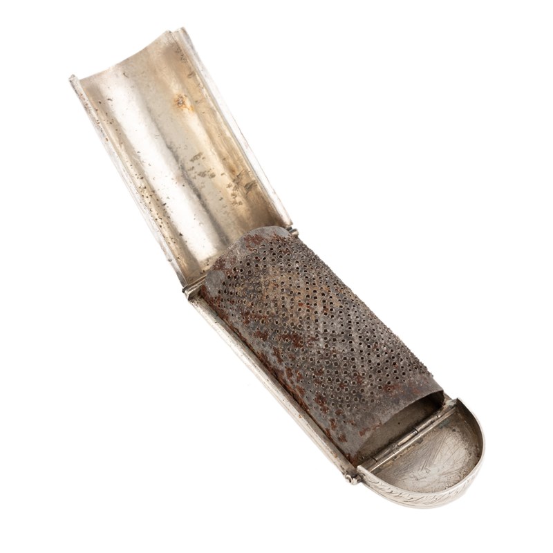 semi-circular form, the hinged cover and side engraved with scroll foliate decoration, with a steel grater to the interior, length 6.8cm, approx. weight 2.1oz.
