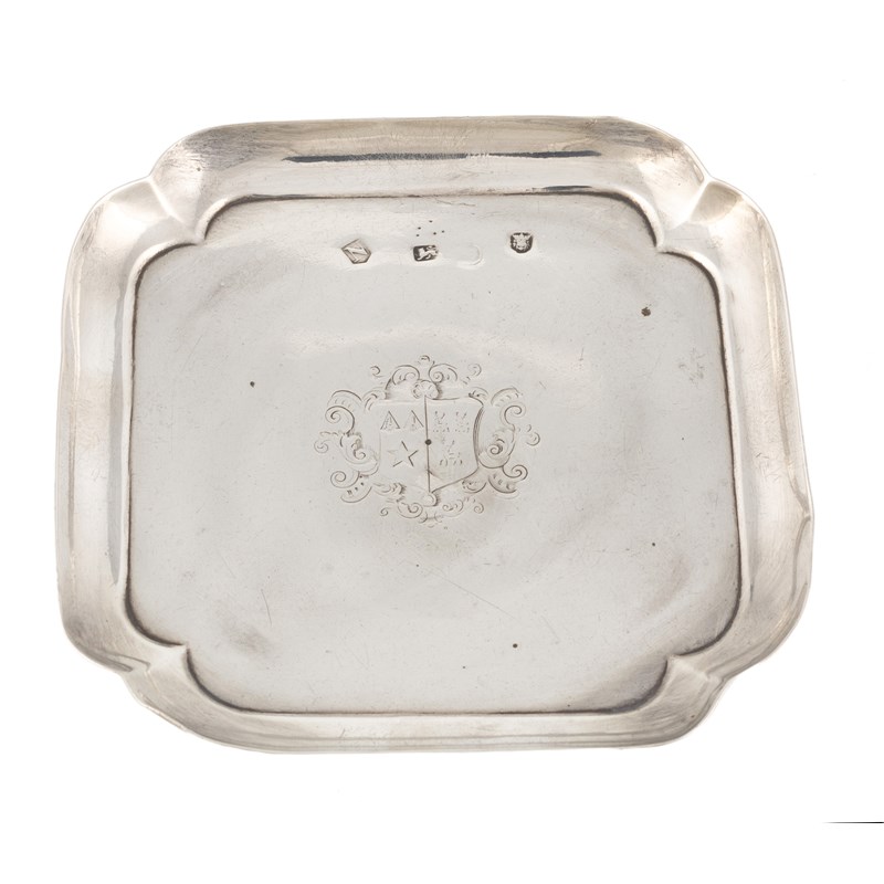 square form, incurved corners, the centre engraved with an armorial within foliate mantling, diameter 13.5cm, approx. weight 4.4oz.