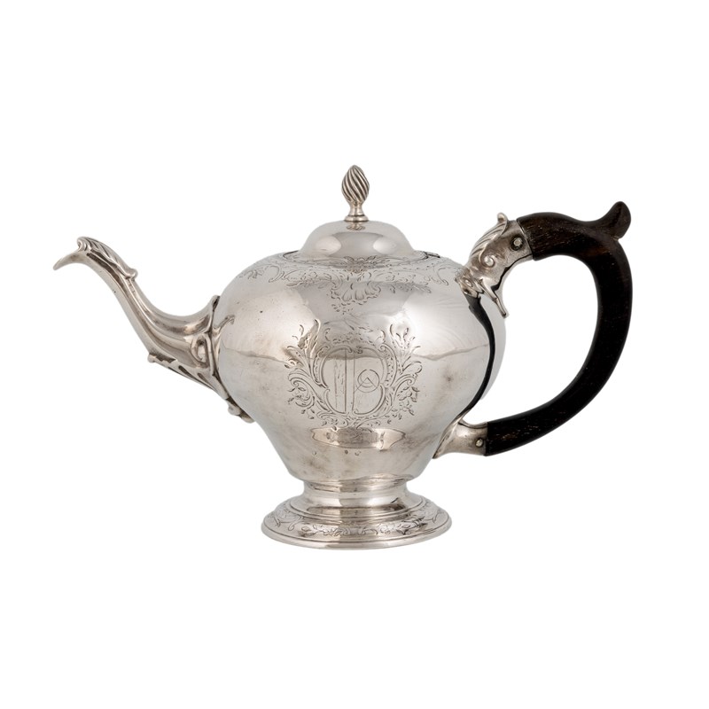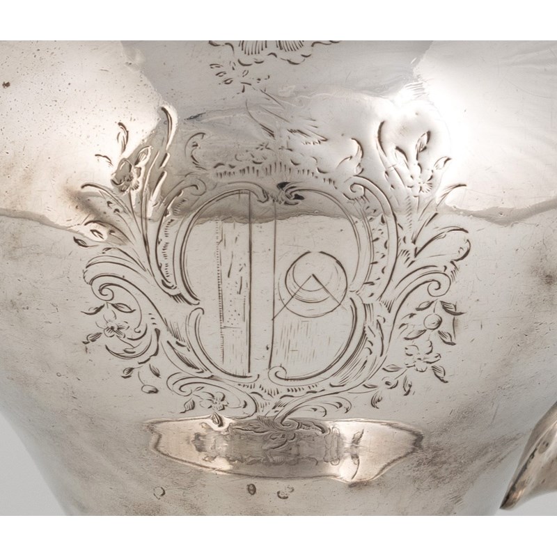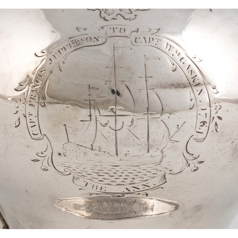 inverted pear form, on a circular foot, with chased foliate decoration, scroll handle, the hinged cover with a fluted finial, the front engraved with a ship with an engraved band surround, inscribed 'Capt. Francis Jefferson to Capt. Wm Gaskin 1764, The Ann', the reverse with an armorial, length handle to spout 23.2cm, approx. weight 16.4oz.