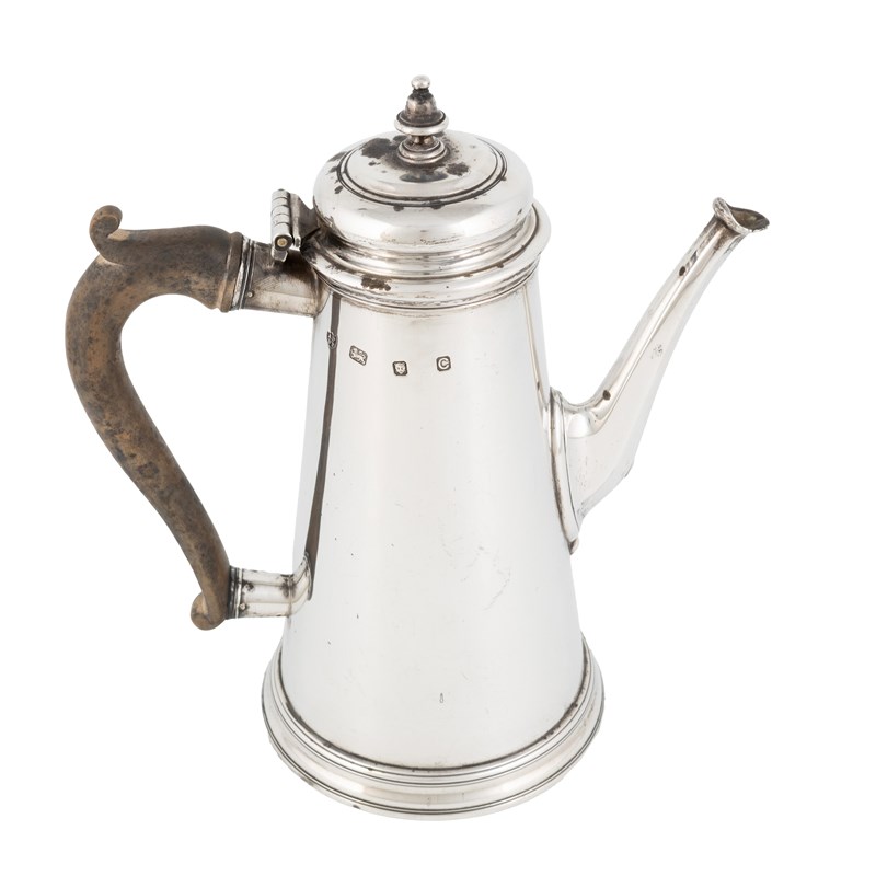 circular tapering form, hinged cover with a knop finial and wooden scroll handle, height 23cm, approx. weight 27.3oz.