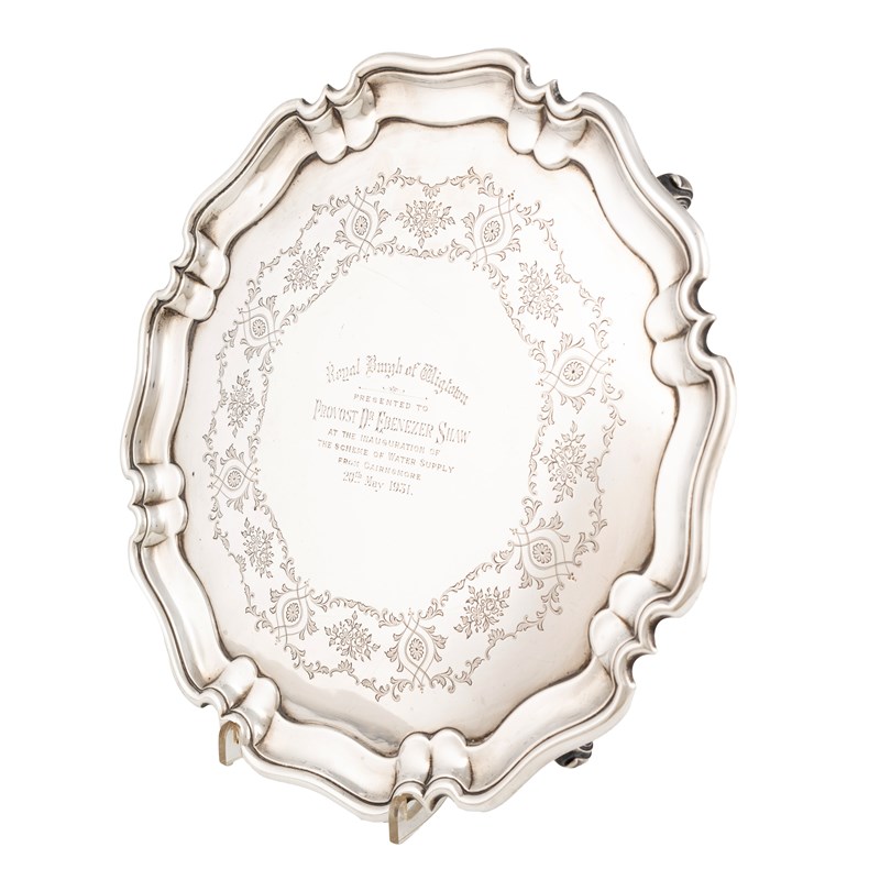 circular shaped with a moulded scalloped edge border, engraved with foliate decoration and inscribed 'Royal Burgh of Wigtown, Presented to Provost Dr Ebenezer Shaw at the inauguration of the scheme water supply from Cairnsmore 20th May 1931', on four gnarl feet, diameter 31.4cm, approx. weight 30.1oz.