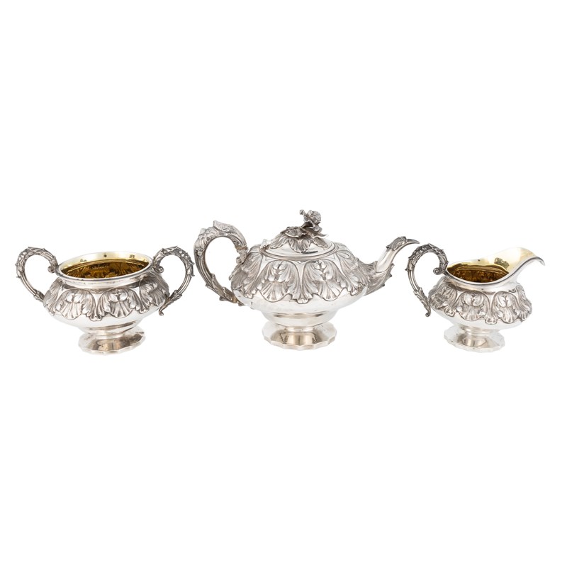 circular bellied form, embossed foliate decoration, the hinged cover with a foliate finial, the leaf-capped scroll handle with ivory insulators, the underside with a presentation inscription, length of teapot 28cm, approx. weight 46oz. (3)