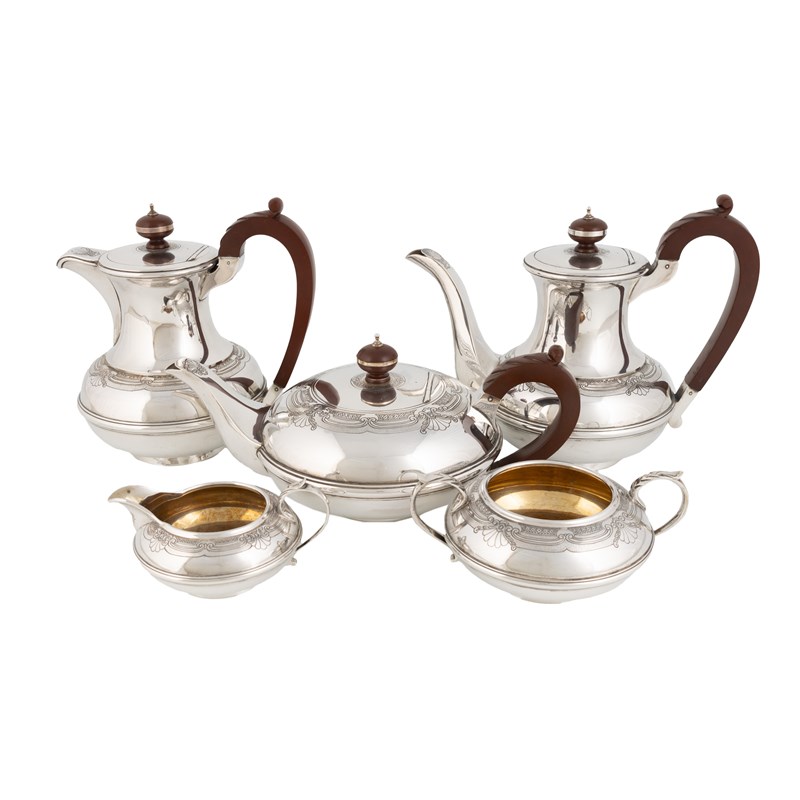 compressed circular and baluster form, chased scroll and fish scale decoration, leaf-capped scroll handles, height of coffee pot 20cm, approx. weight 95oz. (5)