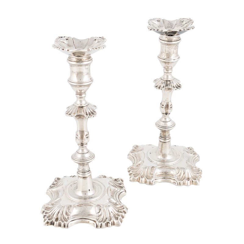 knopped baluster columns, shell shoulders, spool-shaped capitals, detachable drip pans engraved with crests, on raised square bases with shell motifs, height 21.4cm, total approx. weight 29.6oz. (2)
