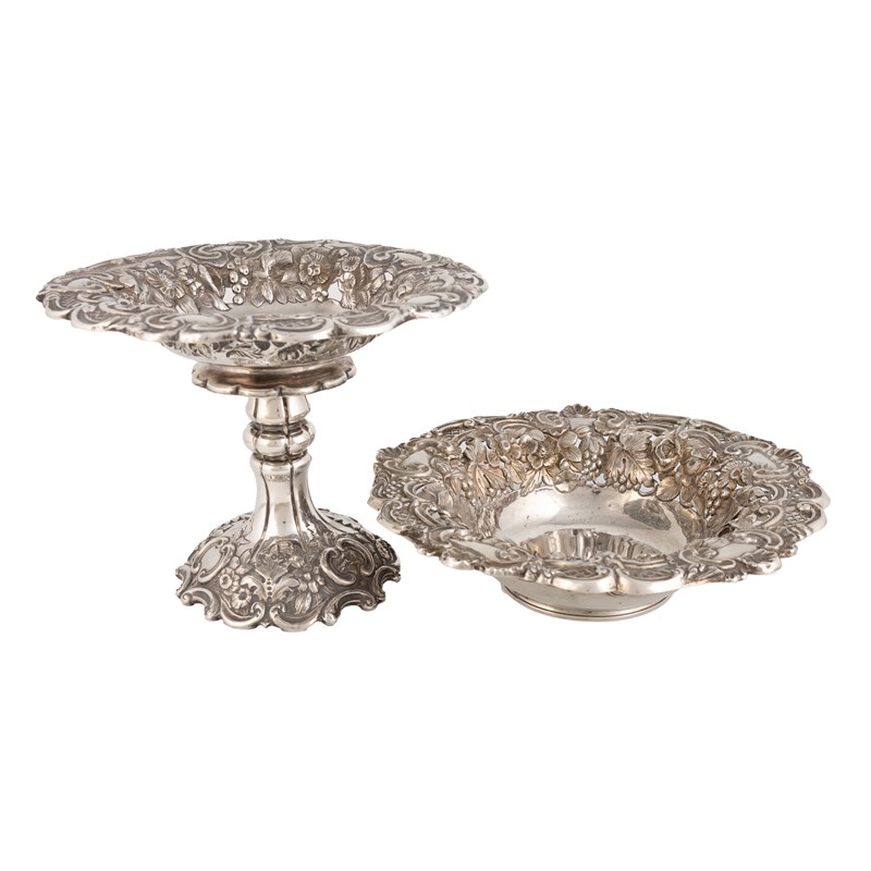 circular form, pierced and embossed foliate scroll and trellis decoration, diameter 26.3cm, plus a Victorian tazza, by Henry Wilkinson and Co., Sheffield 1851, circular form, embossed foliate scroll decoration, on a raised circular foot, height 17.5cm, approx. total weight 34.5oz. (2)