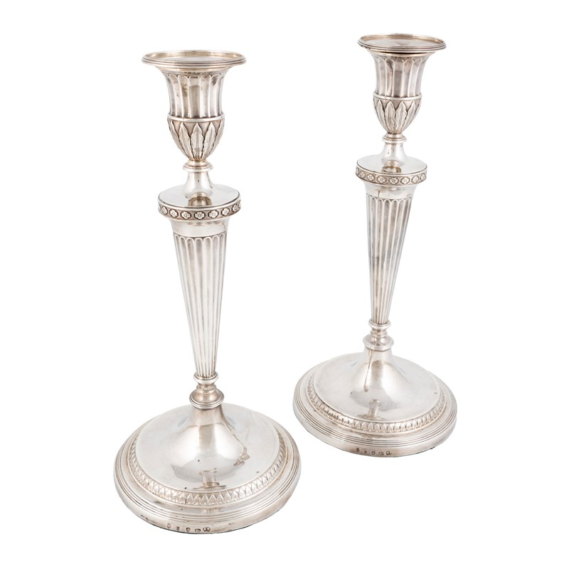 tapering fluted stem, with acanthus leaf flower motif borders, on loaded circular bases, height 31cm. (2)