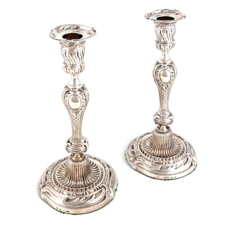baluster columns in the Rococo manner, fluted capitals and circular base with scroll motifs, detachable drip pans, height 27.5cm. (2)