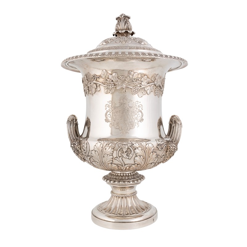 campana form, embossed with trailing grapevines and foliate decoration, the reeded side handles with Bacchus masks, the pull-off cover with a foliate finial, engraved with an armorial and crests, height 41cm, approx. weight 124oz.