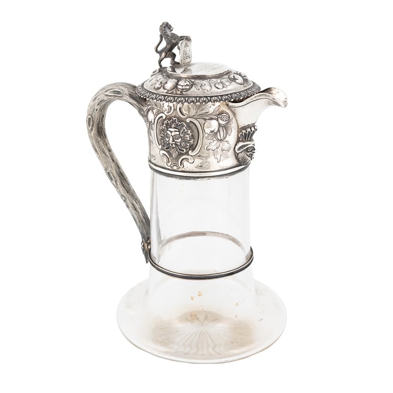 tapering and circular body, the mount with Bacchus masks, foliate scroll decoration, simulated bark scroll handle, the hinged cover with a rampant lion finial holding a crested shield, also inscribed 'Fives Match E. B. Brackenbury V B.F Watson', height 27cm.