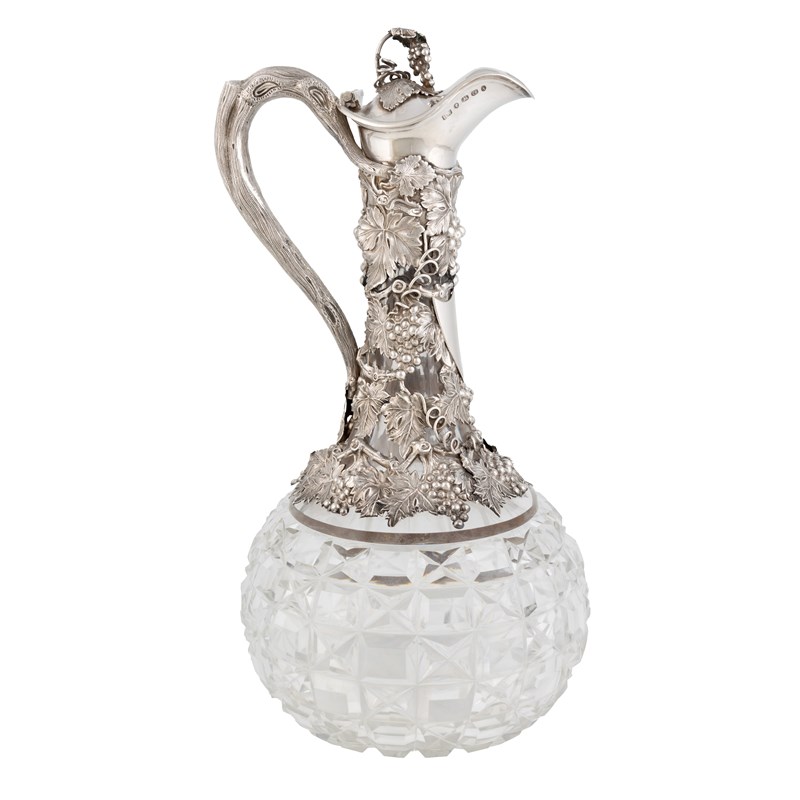 cut glass baluster body with pierced vine and grape decoration, a vacant shield cartouche, the scroll handle in the form of a branch with textured decoration, height 29.8cm.