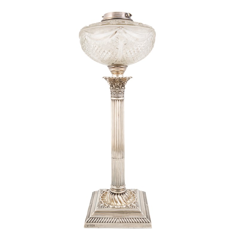 An Edwardian silver Corinthian column oil lamp,