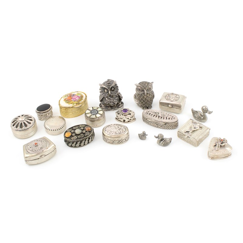 comprising: six silver pill boxes, seven metalware and base metal pill boxes, two owls and a set of three graduating ducks, total approx. weighable 2.2oz. (18)