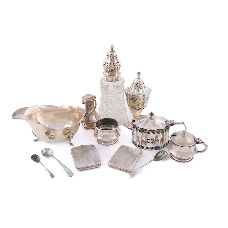 comprising: two vesta cases, two mustard pots, two pepper pots, a sugar caster, a sauce boat, a salt cellar with salt spoon and two condiment spoons, total approx. weighable 12.3oz. (12)