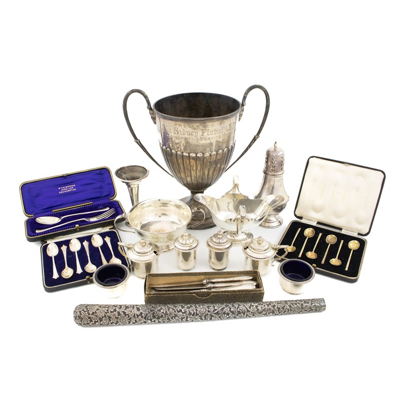 comprising: a two-handled trophy, a two-handled bowl, a sugar caster, a two-handled sauce boat, a pair of pepper pots, a pair of salt cellars, a pair of mustard pots, a parasol handle and other items, total approx. weighable 50.9oz. (qty)