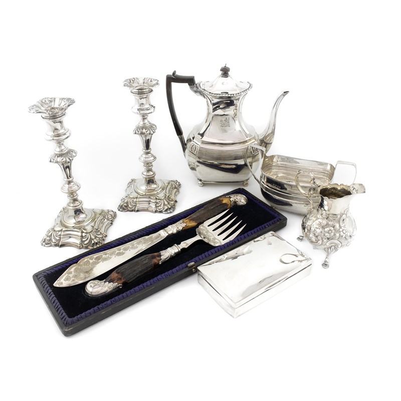 comprising silver items: a coffee pot, by The Barnards, London 1892, a George III sugar bowl, London 1807, a Victorian cream jug of baluster form, a cigarette box, plus a pair of electroplated candlesticks and a cased pair of fish servers with stag horn handles, approx. weighable 33oz. (7)