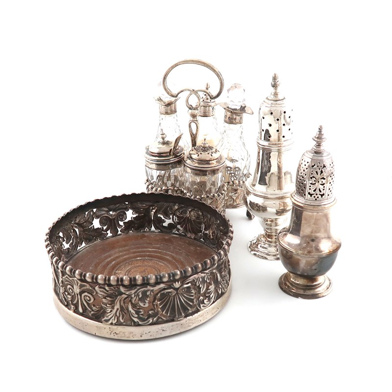 comprising: a late-Victorian silver five-bottle cruet frame, by Thomas Bradbury and Sons, Sheffield 1892, plus a George II caster, London 1746, another caster and a pierced wine coaster, approx. weighable 12oz. (4)