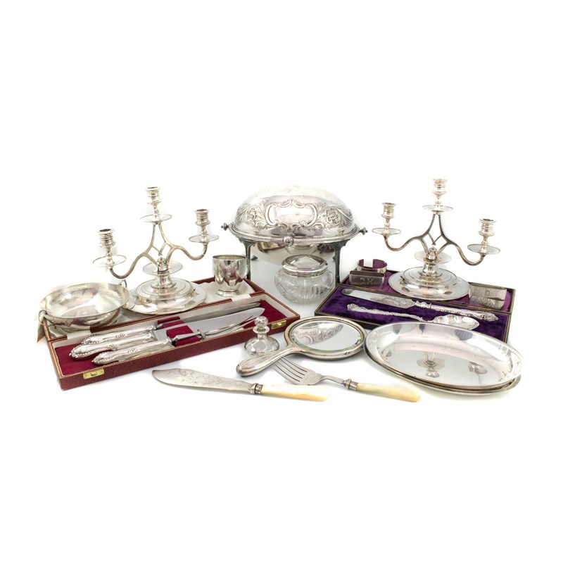 comprising: a silver christening cup, a two-handled bowl, four napkin rings, a silver-mounted hand mirror, a jar and a scent bottle, plus electroplated items: a pair of three-light candelabra, a breakfast roll top serving dish, a pair of fish servers, a cased carving set and a cased cake slice and spoon, total approx. weighable 14.1oz. (16)