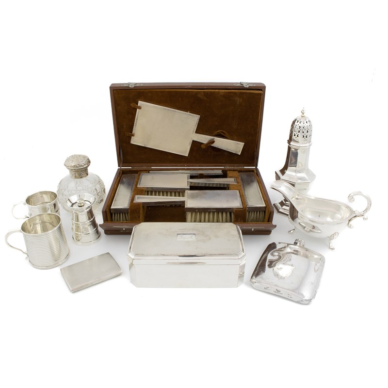 comprising of silver items: a sauce boat, two mugs, a pepper mill, a sugar caster, a cigarette box, a cigarette case and a cased six-piece dressing set, London 1944, with engine-turned decoration, plus an electroplated hip flask, total approx. weighable 22.8oz. (9)