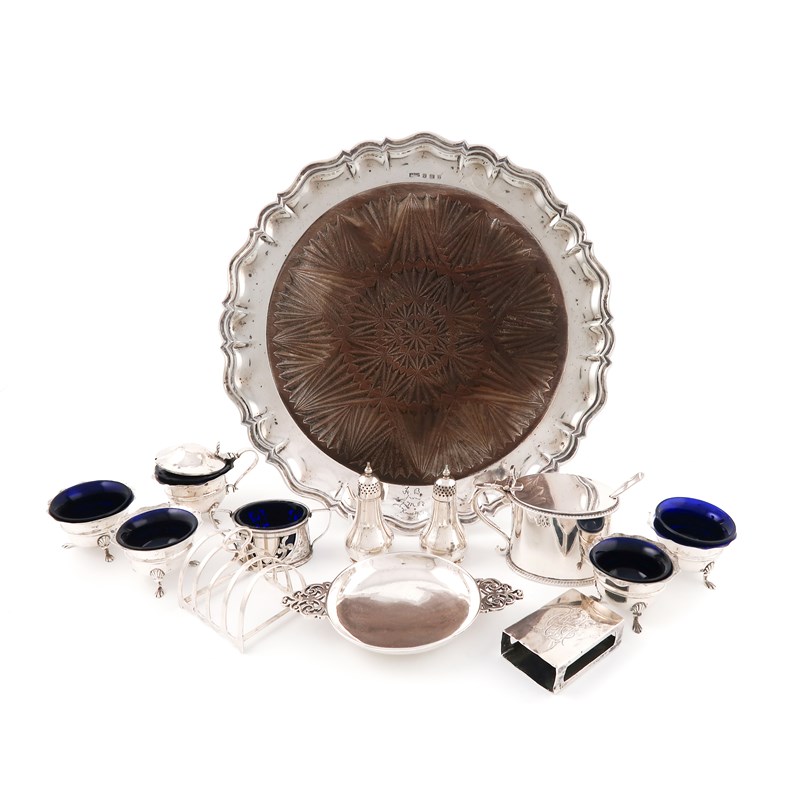 comprising: a silver-mounted wooden breadboard, by James Dixon and Sons, Sheffield 1931, a set of four salt cellars plus another, two mustard pots and a condiment spoon, a pair of pepper pots, a toast rack, a Scottish quaich, a silver salt cellar, and an unmarked matchbox cover, total approx. weighable 17.9oz. (13)