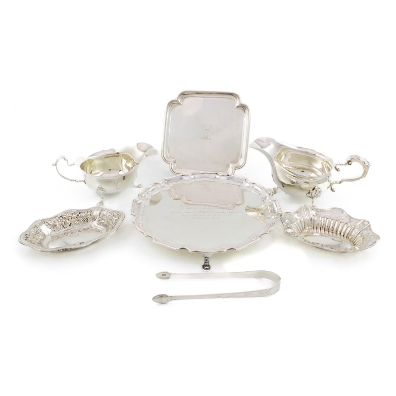 comprising: a Victorian square waiter, by Lambert & Co, London 1880, two pierced dishes, two sauceboats, a pair of sugar tongs and a presentation waiter, diameter 20.6cm total approx. weight 31.4oz. (7)