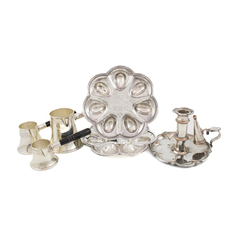 comprising: three graduated Egyptian silver coffee serving pots, a pair of electroplated Duchess of Sutherland Cripples Guild egg dishes, and an old Sheffield plate chamberstick, total approx. weighable 11.8oz. (6)