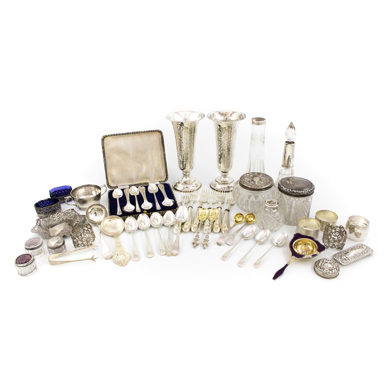 comprising: a pair of vases, by L and T Powell, Birmingham 1921, tapering circular form, spot-hammered decoration, silver-mounted glass bottles and boxes, napkin rings, teaspoons, a pair of salt cellars, and other items, total approx. weighable 34.5 oz.