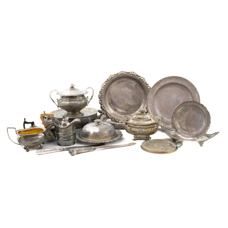 comprising: a 19th century Dutch sauce tureen and cover, 1842, rectangular bellied form, and two silver-handled knives, plus a metalware small dish, and old Sheffield and electroplated items: a pair of plates, a sugar bowl and cover two cream jugs and other items, approx. weighable 15oz. (qty)