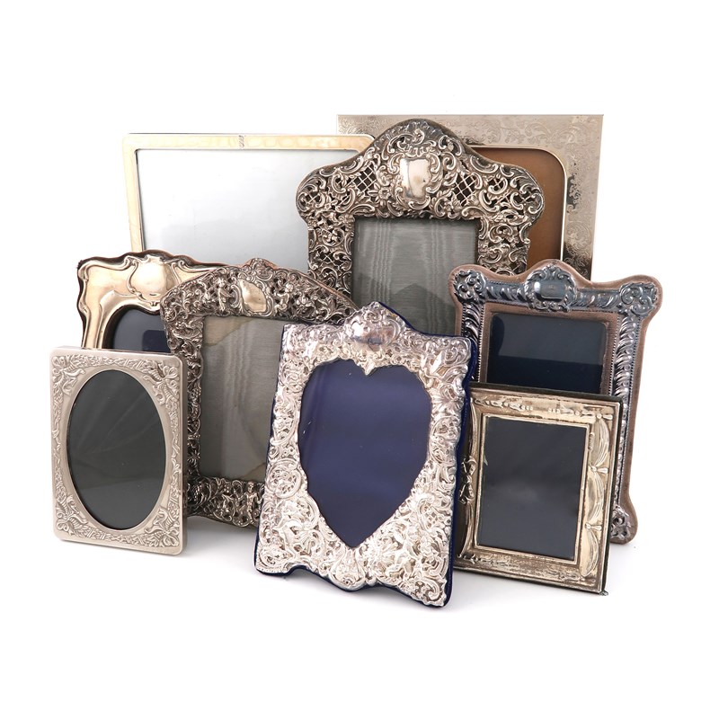 comprising: one of arched rectangular form, by H. Matthews, Birmingham 1900, another of smaller similar design, London 1897, plus four modern frames and three electroplated frames. (9)