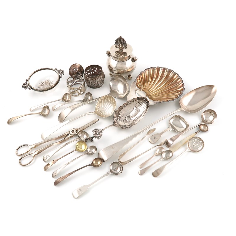 comprising: a Victorian table cigar lighter, globular form, flame finial, plus a Dutch spoon, and Exeter basting spoon, q shell butter dish, a silver-mounted glass dish, a sauce a ladle, a pair of grape scissors, two napkin rings, a bottle stopper, an Aberdeen caddy spoon, by George Booth, and a small quantity of salt spoons and an electroplated ladle, approx. weighable 19.7oz. (qty)